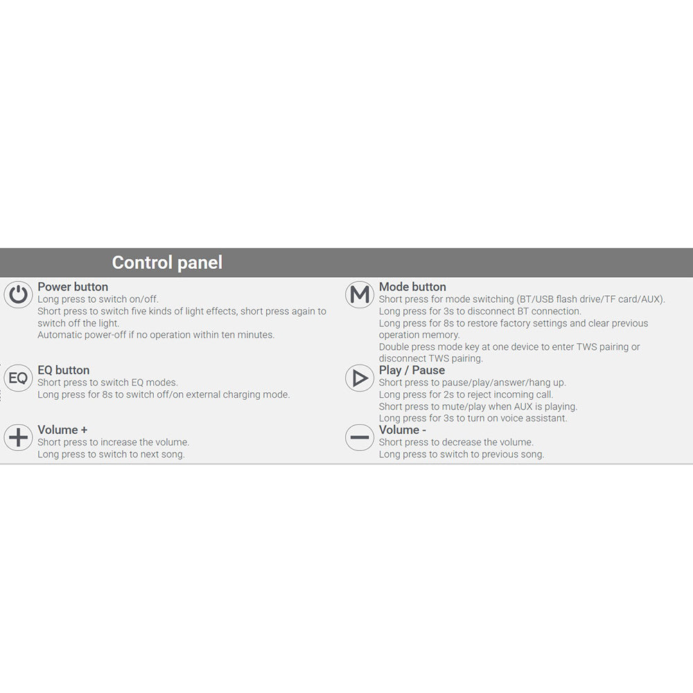 • Usage time (without LED lights / 50% vol.): 9 hours;