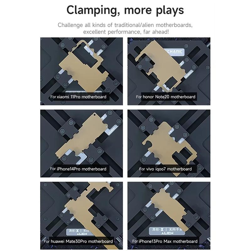 Mechanic Alien X V2.0 PCB Work Holder Mechanic Alien X V2.0 is a universal work holder for motherboards, with a patented design, created to meet the most complex challenges in electronic repairs. Thanks to its innovative structure, this device can secure both traditional motherboards and special and atypical models, providing a stable 360-degree grip without dead angles. The greatest advantage of the square universal clamp is its variable slot design, which allows flexible adjustment for boards and chips of different shapes and sizes. Additionally, the dedicated positioning area for A8-A17 chips ensures maximum stability and precision during repair and assembly processes, significantly increasing work efficiency. Made from premium materials, such as synthetic stone resistant to temperatures up to 500 degrees C and thickened steel plate, the holder guarantees durability and corrosion resistance. The anti-slip silicone components offer comfort in use, reducing hand fatigue, and additional stability through the anti-slip feet. This holder represents a professional and versatile solution, specially designed for technicians who need precision and safety in repair work. Features: - Original, patented product, universal holder for motherboards and chips - Stable 360-degree grip without dead angles - Design with variable slots for compatibility with boards of different shapes and sizes - Precise positioning area for A8-A17 chips, increased work efficiency - Material: synthetic stone resistant to temperatures up to 500 degrees C, corrosion-resistant - Anti-slip silicone components for comfort and stability - High-quality silicone anti-slip feet - Thickened steel plate for increased strength and high support capacity - Compatible with traditional and specially shaped motherboards