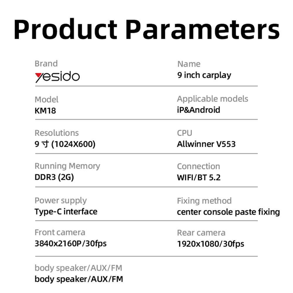 - Functions: CarPlay + Android Auto + AirPlay + WiFi + Bluetooth 5.2 + FM + driving recorder + AUX